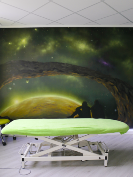 Über die Fenster dieses Raumschiffs kann er nun einzelne Planetenwelten aus der Ferne betrachten. Für ein gezieltes Anwendungsgebiet wird der Kunde anschließend aus dem Raumschiff in eine für ihn eigens gestaltete Welt gebracht und erhält hier die geeignete Therapie.